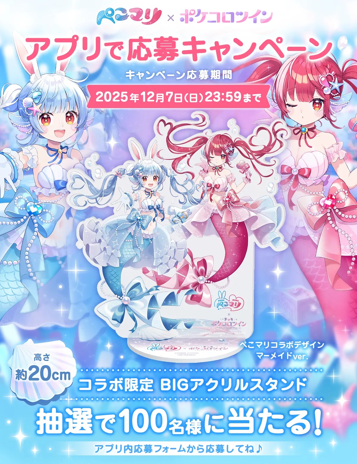 【アプリ】コラボ限定 BIGアクリルスタンドを100名様にプレゼント 2025.11.23ポケコロツイン×ぺこマリ コラボキャンペーン 賞品:コラボ限定 BIGアクリルスタンド(100名様) 締切:2025年12月7日(日)アプリ内からご応募ください。※詳細はキャンペーンページにてご確認ください。応募はこちらから