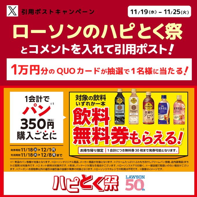 【X懸賞】QUOカード10,000円分を1名様にプレゼント 2025.11.23ローソン‐プレゼントキャンペーン 賞品:QUOカード10,000円分(1名様) 締切:2025年11月25日(火)①@akiko_lawsonをフォロー ②「ローソンのハピとく祭」とコメントを入れて引用ポスト※詳細はキャンペーンページにてご確認ください。応募はこちらから