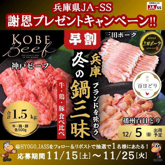 【X懸賞】冬の鍋三昧セットを1名様にプレゼント 2025.11.23兵庫県JA-SS‐謝恩プレゼントキャンペーン 賞品:冬の鍋三昧セット(1名様) 締切:2025年11月25日(火)公式X(Twitter)アカウントをフォロー&キャンペーン対象ポストをリポストしてご応募ください。※詳細はキャンペーンページにてご確認ください。応募はこちらから
