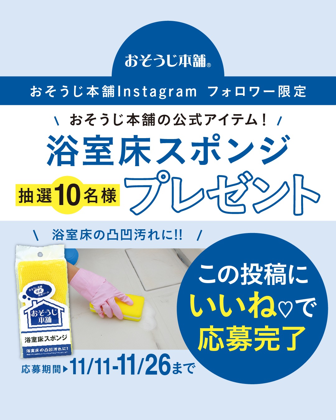 【Instagram懸賞】浴室床スポンジを10名様にプレゼント 2025.11.24おそうじ本舗‐フォロー&いいねキャンペーン 賞品:浴室床スポンジ(10名様) 締切:2025年11月26日(水)応募方法: 1. 公式Instagramアカウントをフォロー 2. 対象の投稿に「いいね!」※詳細はキャンペーンページにてご確認ください。応募はこちらから