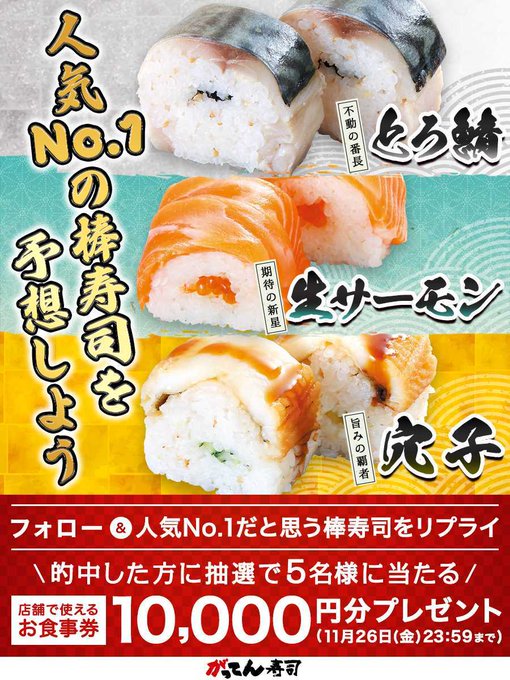 【X懸賞】お食事券10,000円分を5名様にプレゼント 2025.11.25がってん寿司‐1番人気を予想しよう 賞品:お食事券10,000円分(5名様) 締切:2025年11月26日(水)応募方法 ①@sushi_gatten をフォロー ②1番人気だと思う商品をコメント欄でリプライ※詳細はキャンペーンページにてご確認ください。応募はこちらから