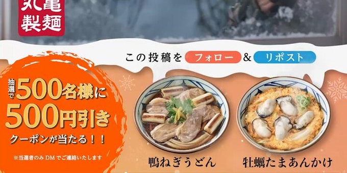 賞品:「鴨ねぎうどん」「牡蠣たまあんかけうどん」「牡蠣バターぶっかけうどん」にご利用いただける500円引きクーポン(500名様)