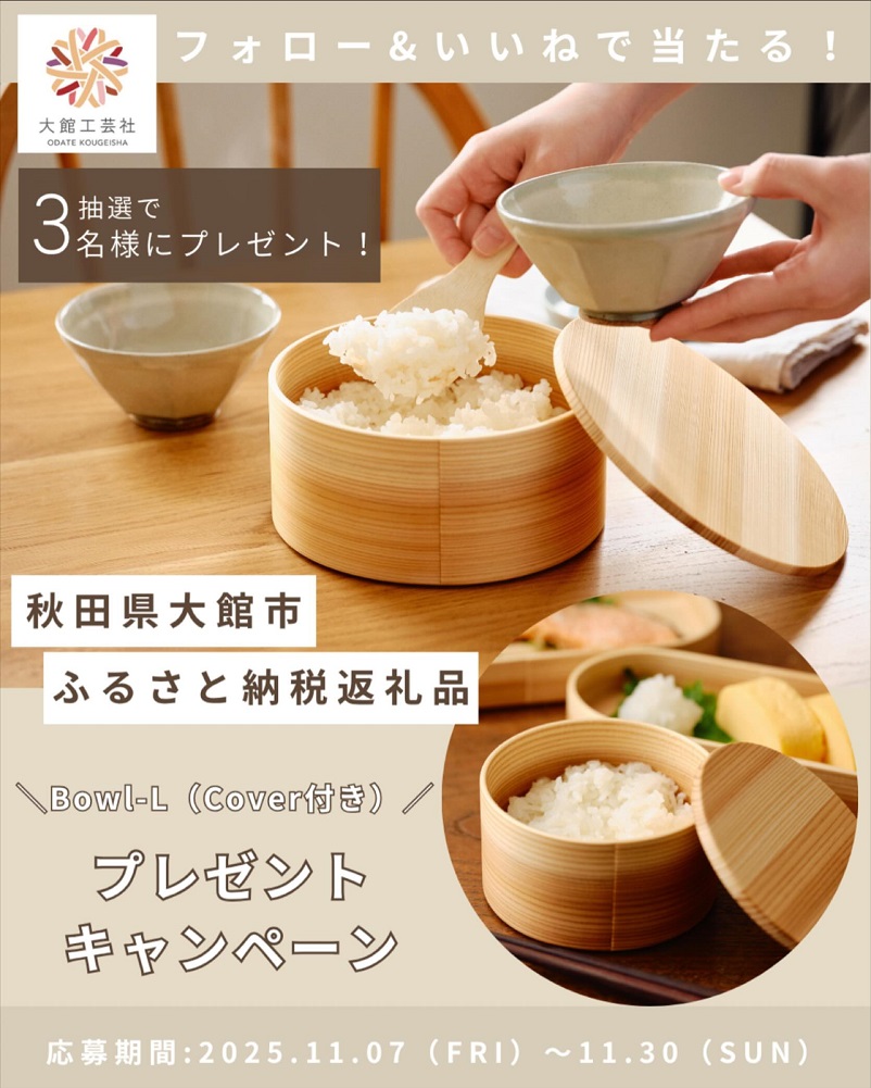 賞品:秋田杉を使った曲げわっぱ Bowl-L(Cover付き)(3名様)