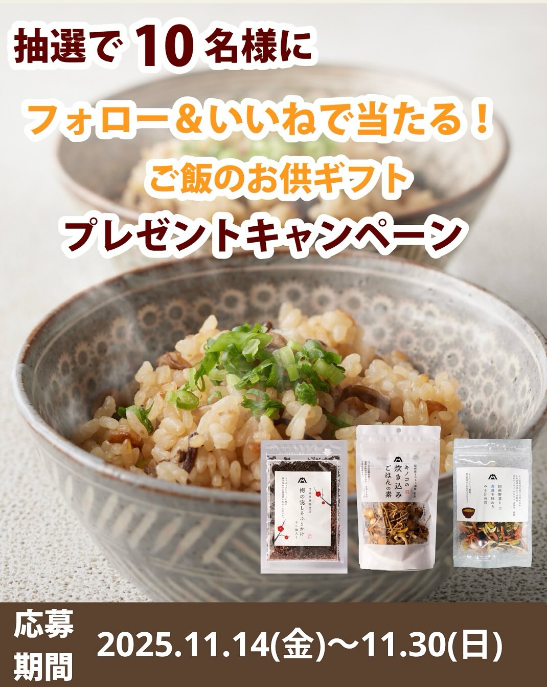 賞品:ご飯のお供ギフト(キノコの炊き込みご飯の素・梅の実しそふりかけ・国産野菜と海藻を味わうみそ汁の具)(10名様)