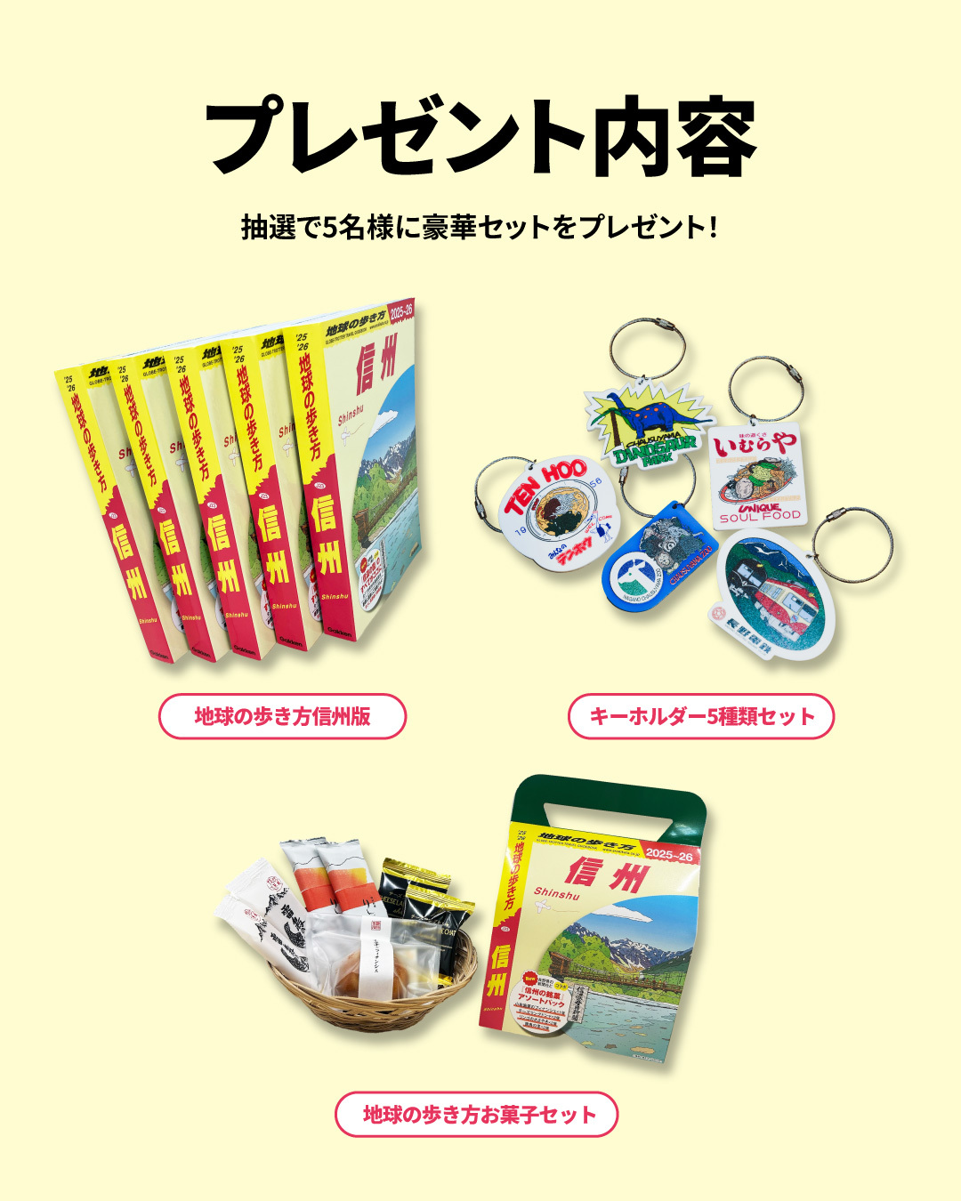 賞品:キーホルダー5種類セット&地球の歩き方信州版&地球の歩き方お菓子セット(5名様)