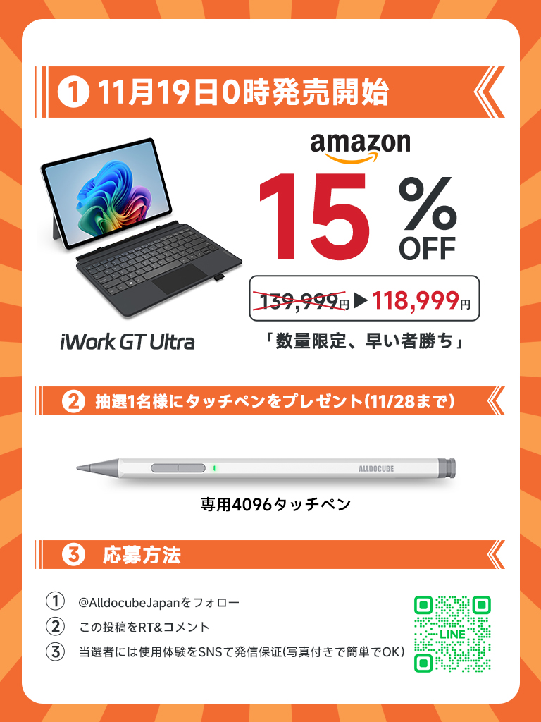 【X懸賞】専用4096タッチペンを1名様にプレゼント 2025.11.27 2025.11.26Alldocube Japan‐新品発売+抽選キャンペーン 賞品:専用4096タッチペン(1名様) 締切:2025年11月28日(金)応募方法: ①@AlldocubeJapan をフォロー ②投稿をRT&コメント※詳細はキャンペーンページにてご確認ください。応募はこちらから