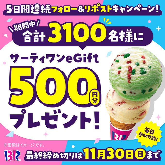 サーティワン アイスクリーム公式X(Twitter)アカウントをフォロー&キャンペーン対象ポストをリポストしてご応募ください。