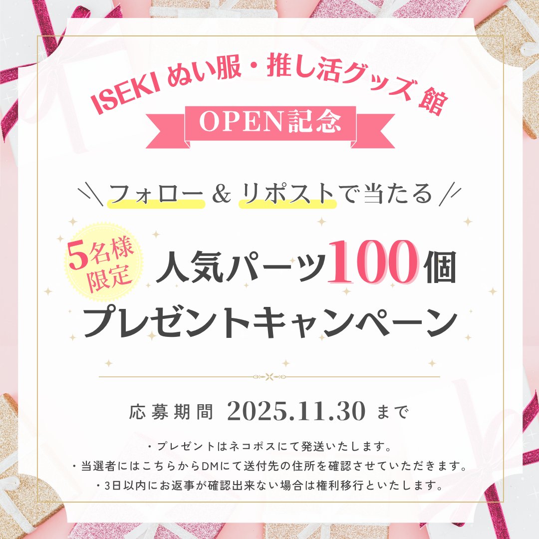 【X懸賞】人気パーツ100個を5名様にプレゼント 2025.11.27ISEKI ぬい服推し活館オープン記念 賞品:人気パーツ100個(5名様) 締切:2025年11月30日(日)公式X(Twitter)アカウントをフォロー&キャンペーン対象ポストをリポストしてご応募ください。※詳細はキャンペーンページにてご確認ください。応募はこちらから