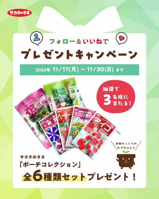 賞品:カプセルトイ「サカタのタネ ポーチコレクション 全6種セット」(3名様)