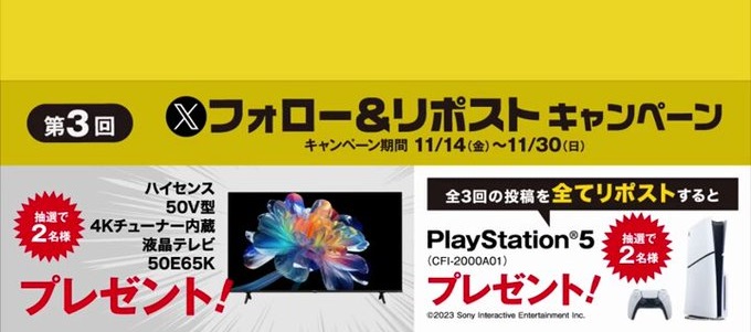 【X懸賞】ハイセンス 4Kチューナー内蔵 50V型液晶テレビ、PlayStation 5を合計4名様にプレゼント