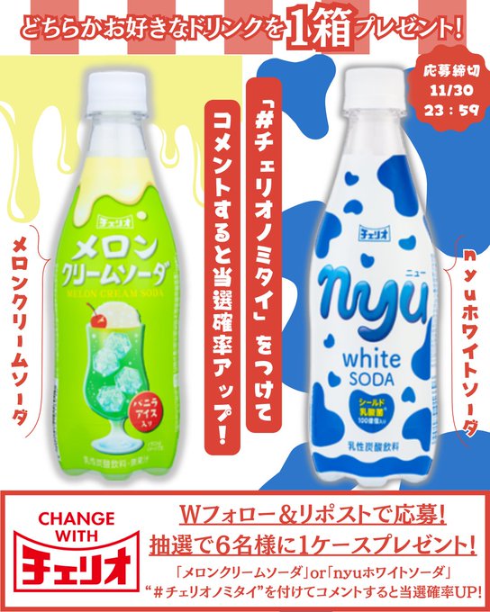賞品:チェリオ メロンクリームソーダ・nyuホワイトソーダ 1ケース(6名様)