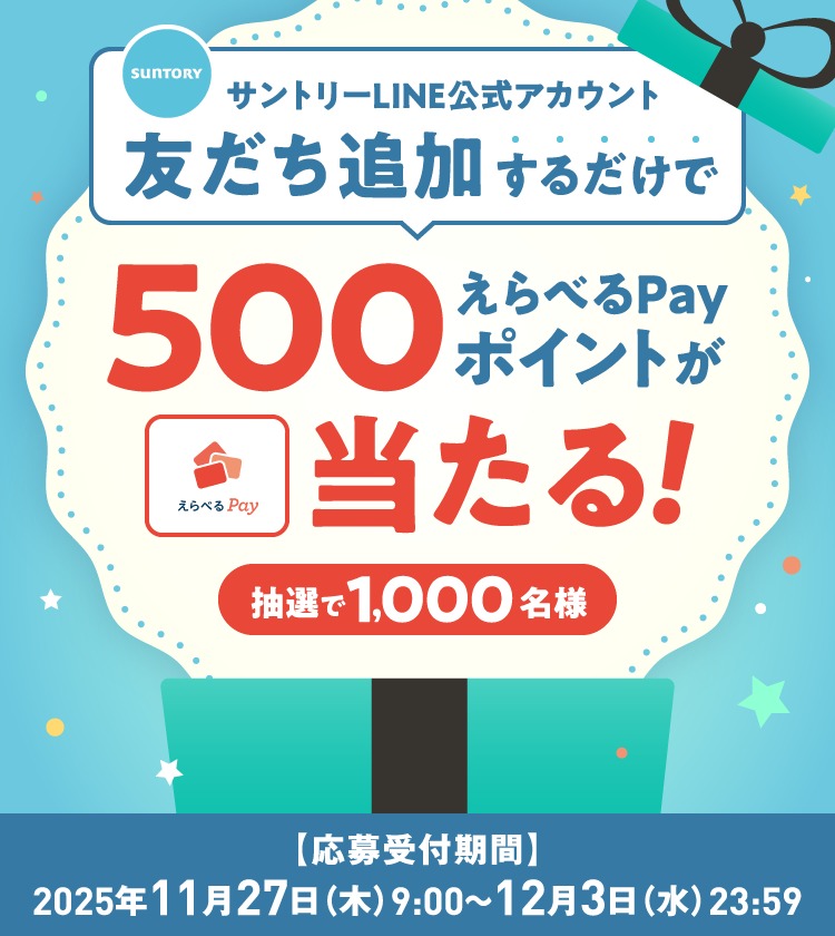 サントリーLINE公式アカウントを友だち追加するだけで、えらべるPay500ポイントが当たる!