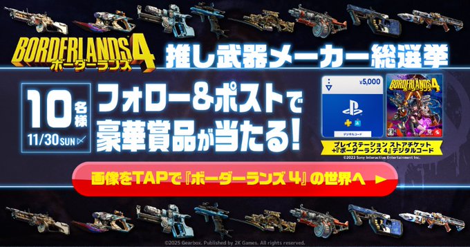 賞品:プレイステーション ストアチケット&『ボーダーランズ 4』デジタル版コード(10名様)