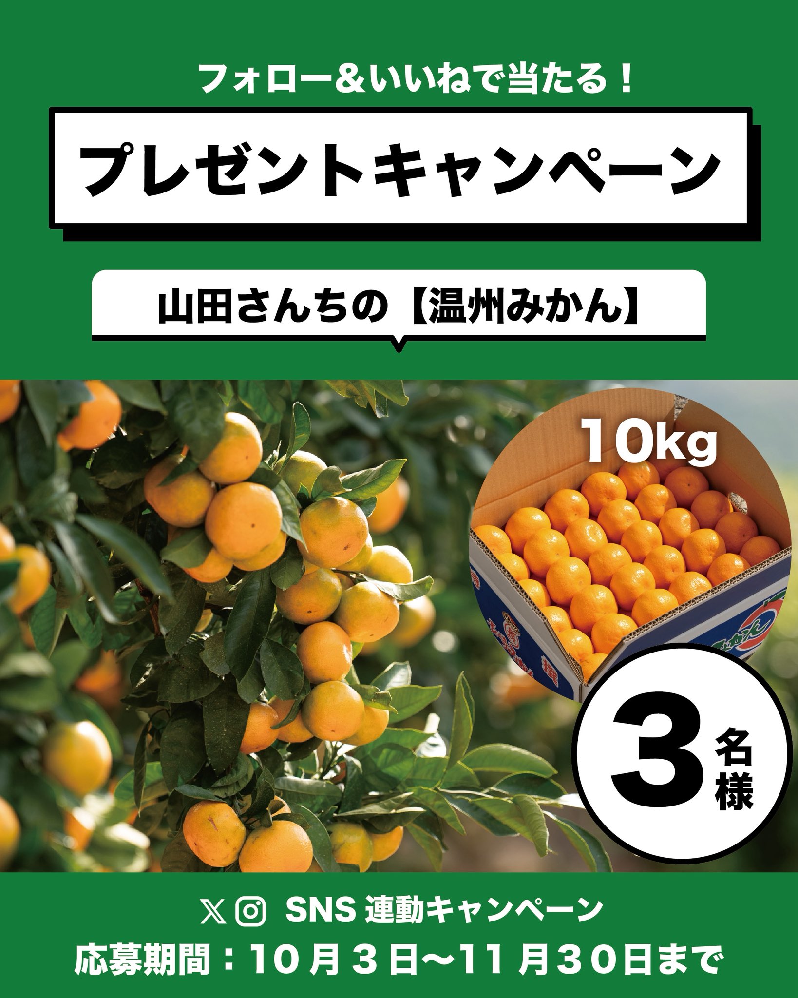 【X・Instagram懸賞】温州みかん10kgを3名様にプレゼント 2025.11.29まるごと東そのぎ‐プレゼントキャンペーン 賞品:温州みかん10kg(3名様) 締切:2025年11月30日(日)参加方法 ①アカウントをフォロー ②投稿へいいね!※詳細はキャンペーンページにてご確認ください。応募はこちらから