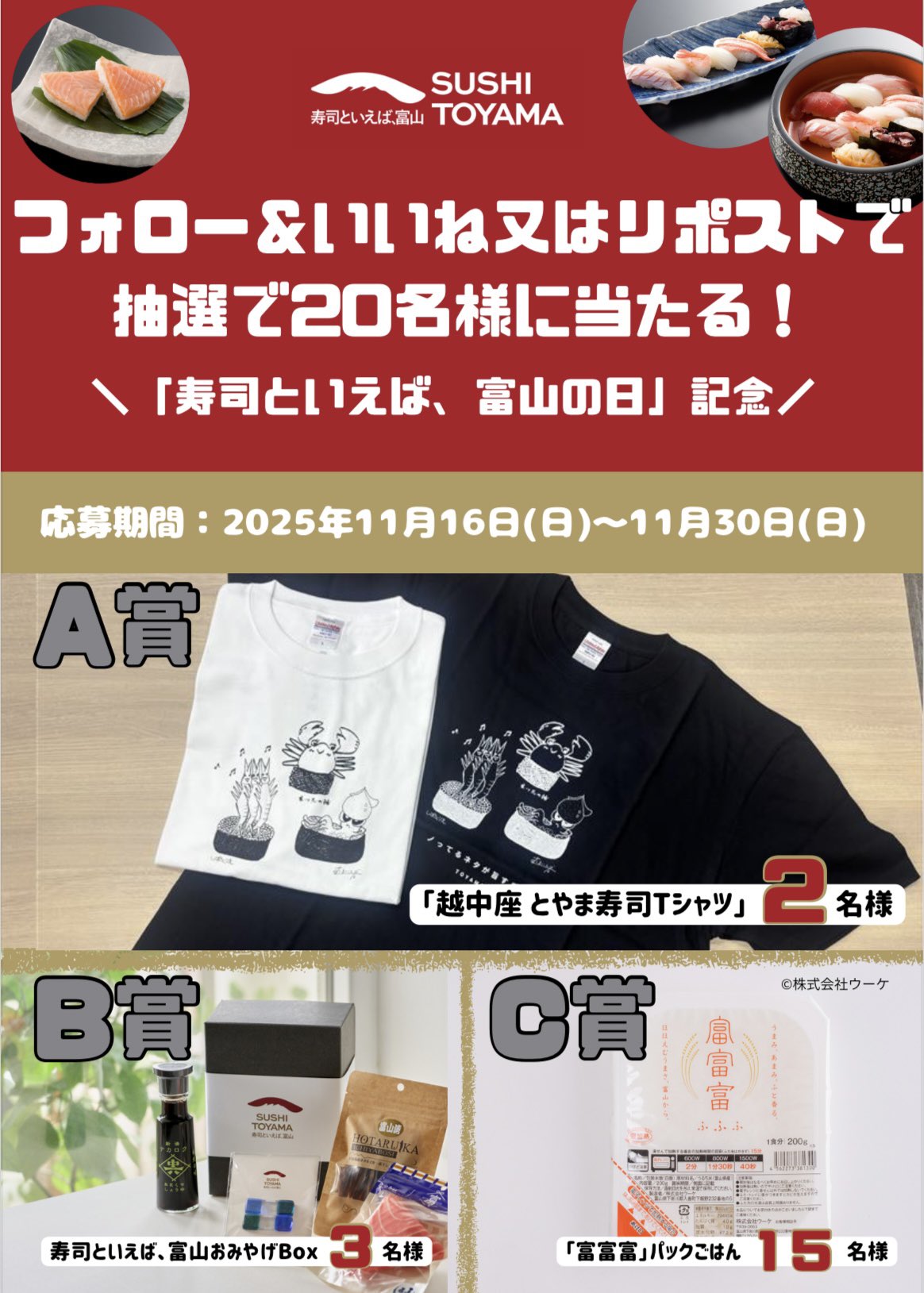 賞品:とやま寿司Tシャツ、富山みやげBox、富富富パックごはん(合計20名様)