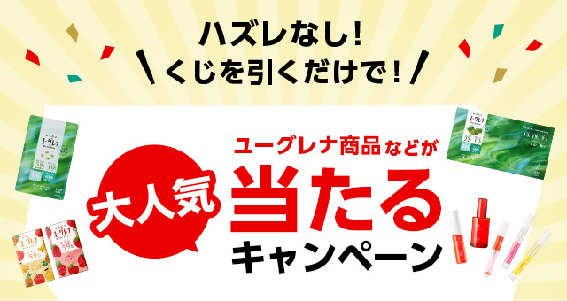 くじを引くと、からだにユーグレナ豪華セットまたは大人気CONCシリーズ豪華セットや、ユーグレナ公式ショップ ヤフー店でご利用いただけるお得なクーポンが当たります。