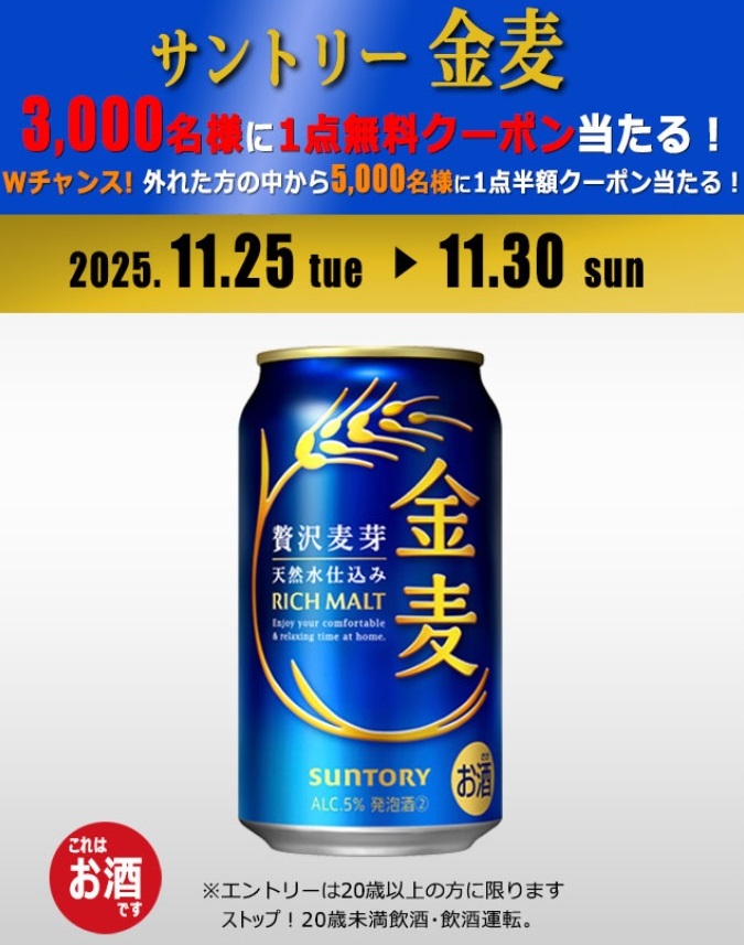 賞品:金麦350ml 無料引き換えクーポン(3,000名様)