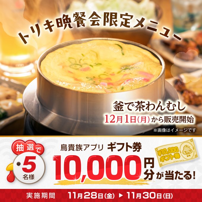 賞品:鳥貴族アプリギフト券10,000円分(5名様)