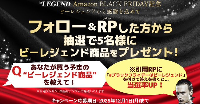 【X懸賞】ビーレジェンド商品を5名様にプレゼント 2025.11.29ビーレジェンド‐#Amazonブラックフライデー 記念 賞品:ビーレジェンド商品(5名様) 締切:2025年12月1日(月)参加方法 ①フォロー&RP ②RPに「#ブラックフライデーはビーレジェンド」を付けて投稿※詳細はキャンペーンページにてご確認ください。応募はこちらから