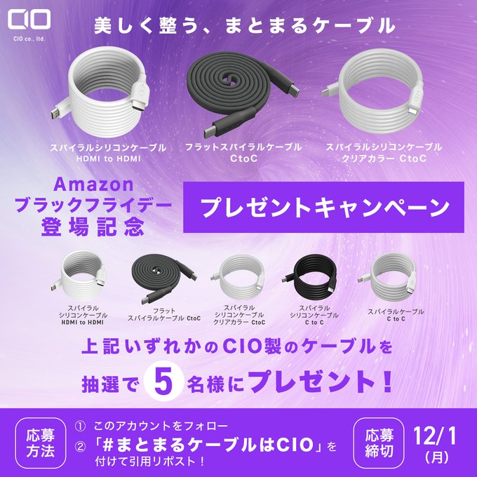 【X懸賞】CIOのケーブルを5名様にプレゼント 2025.11.29CIO‐プレゼントキャンペーン 賞品:CIOのケーブル(5名様) 締切:2025年12月1日(月)アカウントをフォロー&「#まとまるケーブルはCIO」をつけて引用リポストで、抽選で5名様にプレゼント※詳細はキャンペーンページにてご確認ください。応募はこちらから