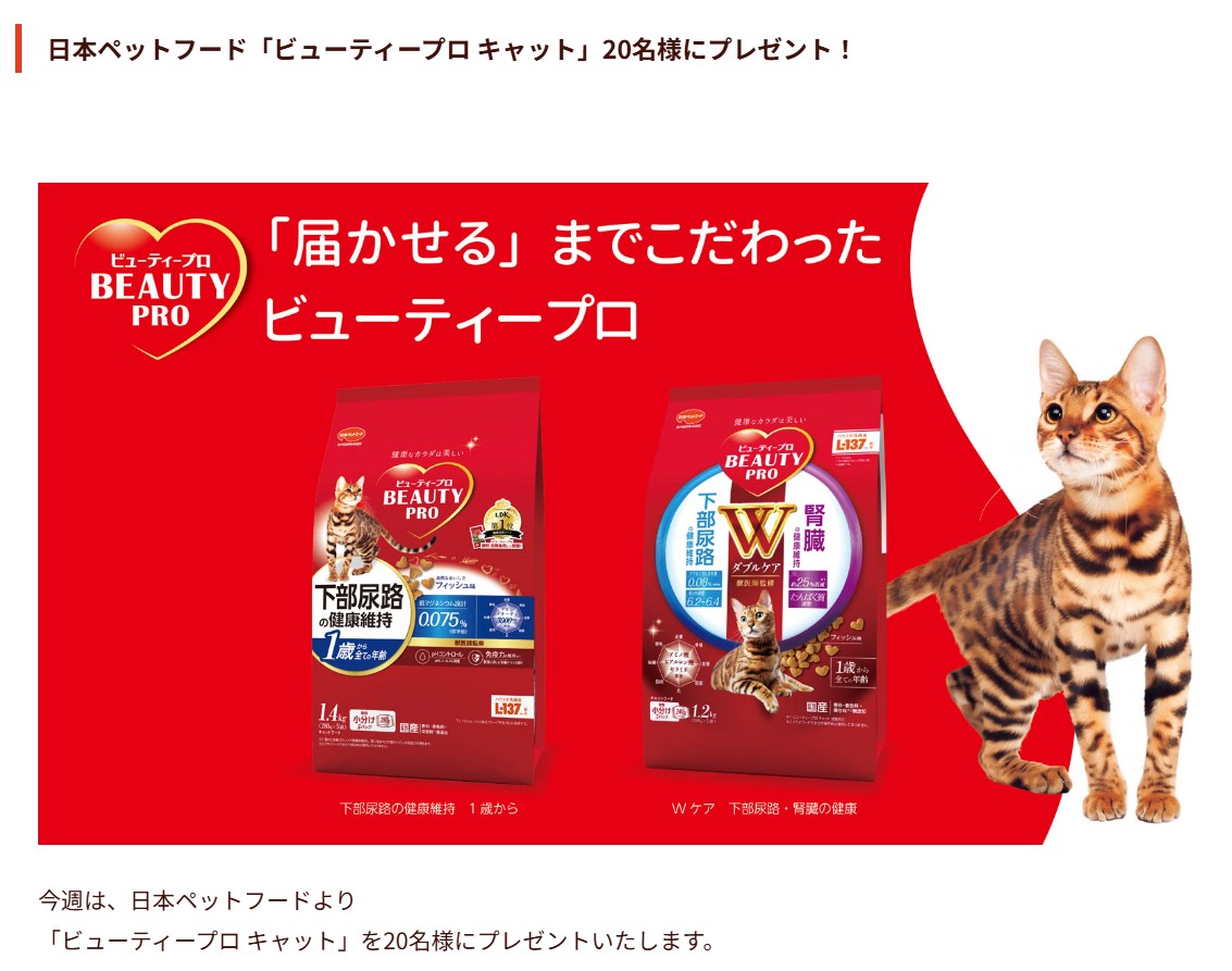 賞品:日本ペットフード「ビューティープロ キャット」(20名様)