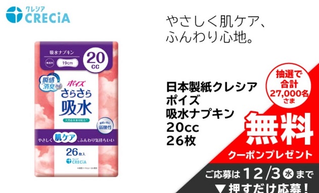 ポイズ吸水ナプキン20cc 26枚 引き換えクーポン 27000名さま