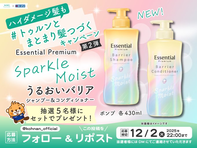 賞品:花王エッセンシャルプレミアム スパークルモイスト バリアシャンプー・バリアコンディショナー ポンプ(5名様)