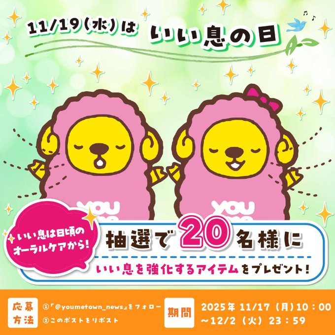 【X懸賞】いい息を強化するアイテムを20名様にプレゼント 2025.11.30ゆめニュースいい息の日キャンペーン 賞品:いい息を強化するアイテム(20名様) 締切:2025年12月2日(火)公式X(Twitter)アカウントをフォロー&キャンペーン対象ポストをリポストしてご応募ください。※詳細はキャンペーンページにてご確認ください。応募はこちらから