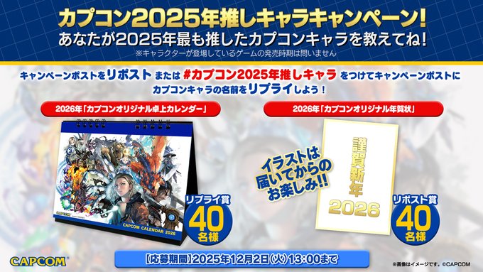 ②リプライ賞:2025年に最も推したカプコンキャラクターの名前を「#カプコン2025年推しキャラ 」を付けて、キャンペーン対象ポストにリプライ