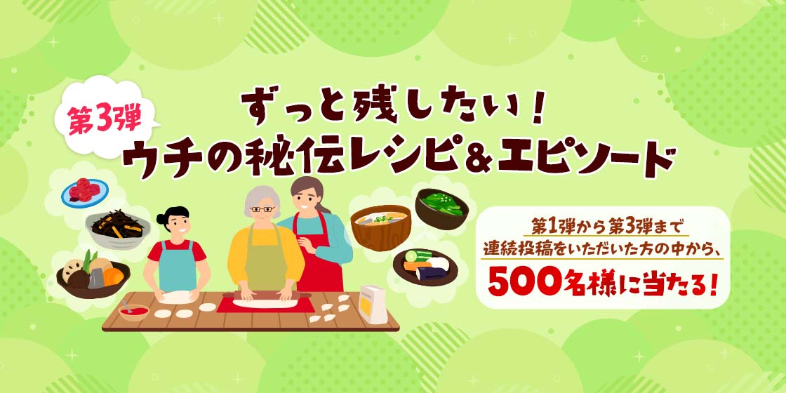 第1弾、第2弾、第3弾のテーマにそれぞれ投稿いただいた方の中から抽選で500名様にハウス製品をプレゼント!
