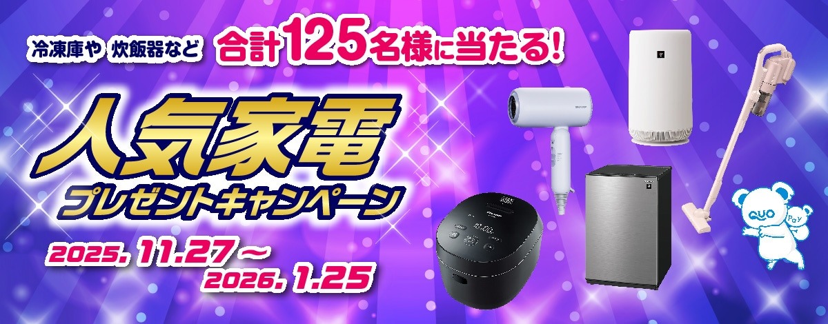 冷凍庫、コードレススティック掃除機、炊飯器、空気清浄機、ドライヤー、QUOカードPay500円分を合計125名様にプレゼント