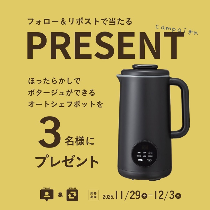【X懸賞】オートシェフポットを3名様にプレゼント 2025.12.01シービージャパン‐フォロー&リポストキャンペーン 賞品:オートシェフポット(3名様) 締切:2025年12月3日(水)公式X(Twitter)アカウントをフォロー&キャンペーン対象ポストをリポストしてご応募ください。※詳細はキャンペーンページにてご確認ください。応募はこちらから