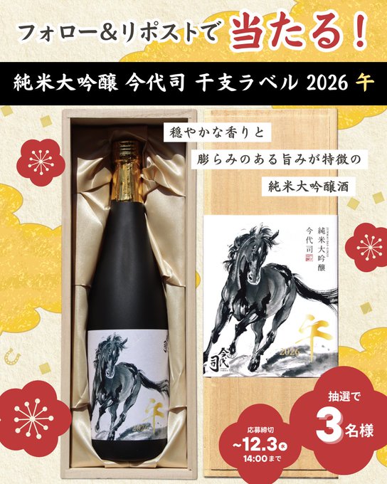 賞品:純米大吟醸 今代司 干支ラベル 2026 午(3名様)
