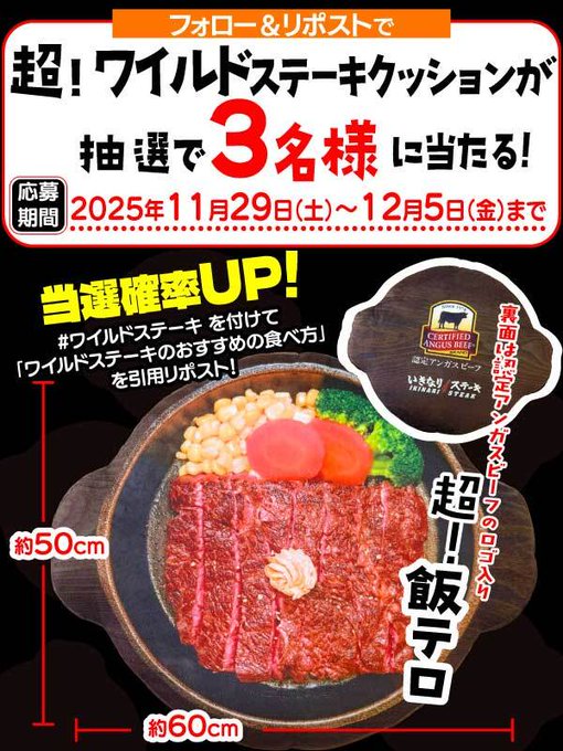 いきなり!ステーキ公式X(Twitter)アカウントをフォロー&キャンペーン対象ポストをリポストしてご応募ください。