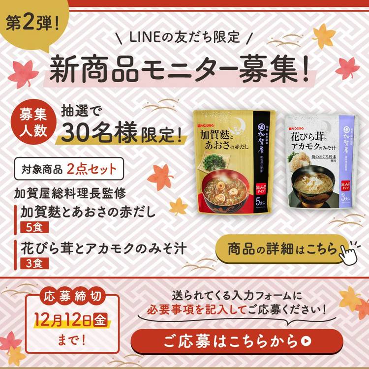 賞品:加賀屋総料理長監修 加賀麩とあおさの赤だし 5食&花びら茸とアカモクのみそ汁 3食(30名様)