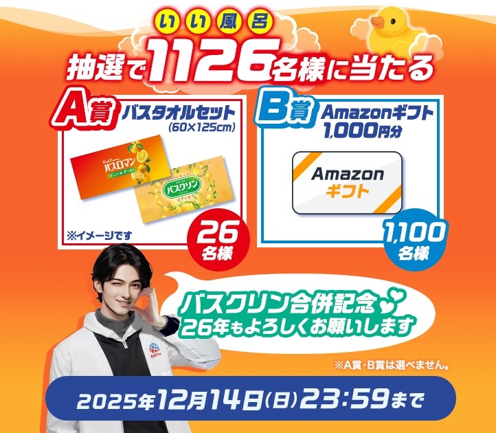 【LINE懸賞】バスタオルセット、Amazonギフト券1,000円分を1,126名様にプレゼント 2025.12.02アース製薬‐いい風呂キャンペーン 賞品: バスタオル(26名様) Amazonギフト券1,000円分(1,100名様) 締切:2025年12月14日(日)キャンペーンページからご応募ください。※詳細はキャンペーンページにてご確認ください。応募はこちらから