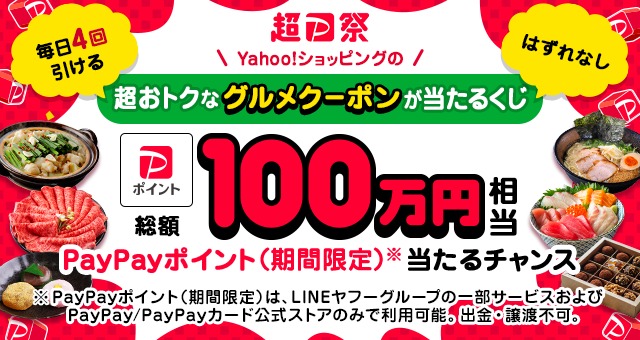 くじを引くとPayPayポイント(期間限定)やYahoo!ショッピングでご利用いただけるクーポンが当たります。