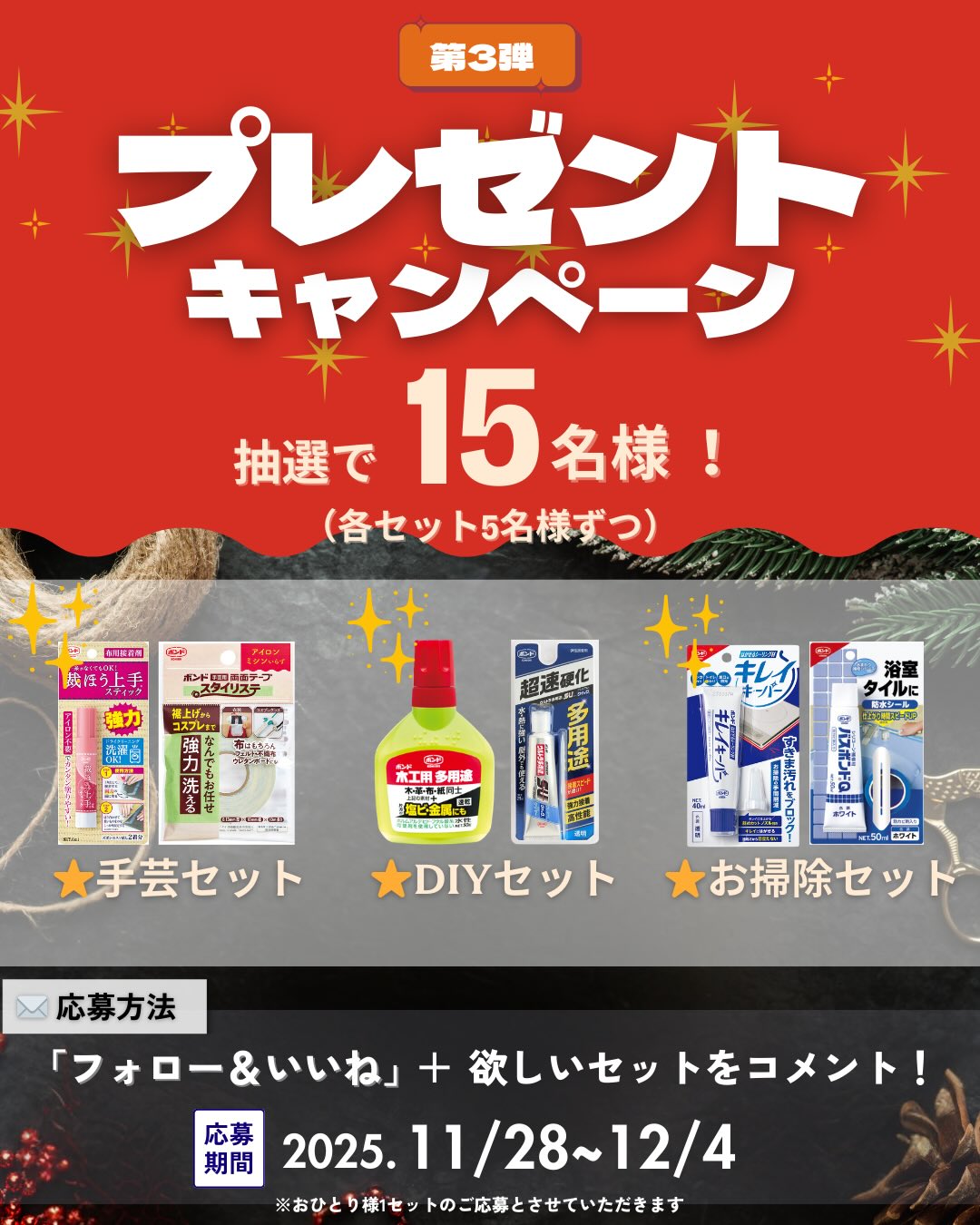 賞品:手芸セット、DIYセット、お掃除セット(合計15名様)
