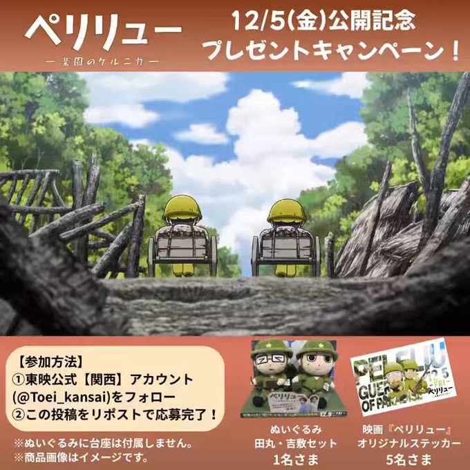 【X懸賞】映画『ペリリュー 楽園のゲルニカ』オリジナルグッズを6名様にプレゼント 2025.12.03東映公式【関西】‐フォロー&リポストキャンペーン 賞品:映画オリジナルグッズ(6名様) 締切:2025年12月4日(木)公式X(Twitter)アカウントをフォロー&キャンペーン対象ポストをリポストしてご応募ください。※詳細はキャンペーンページにてご確認ください。応募はこちらから