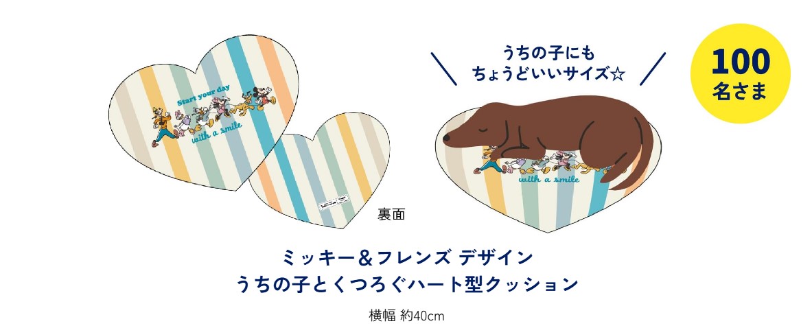 賞品:ミッキー&フレンズ デザイン うちの子とくつろぐハート型クッション(100名様)