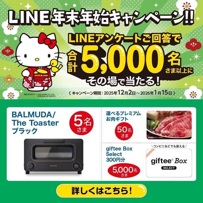 【LINE懸賞】BALMUDA The Toaster、選べるプレミアムお肉ギフト、giftee Box Select 300円分が合計5,055名様にその場で当たる!