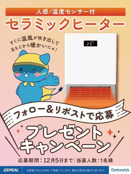 賞品:人感/温度センサー付セラミックヒーター(1名様)