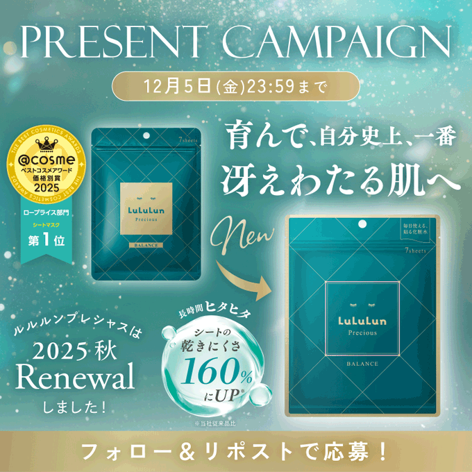 【X懸賞】プレシャスGREENを30名様にプレゼント 2025.12.04ルルルン‐フォロー&リポストキャンペーン 賞品:プレシャスGREEN(30名様) 締切:2025年12月5日(金)公式X(Twitter)アカウントをフォロー&キャンペーン対象ポストをリポストしてご応募ください。※詳細はキャンペーンページにてご確認ください。応募はこちらから