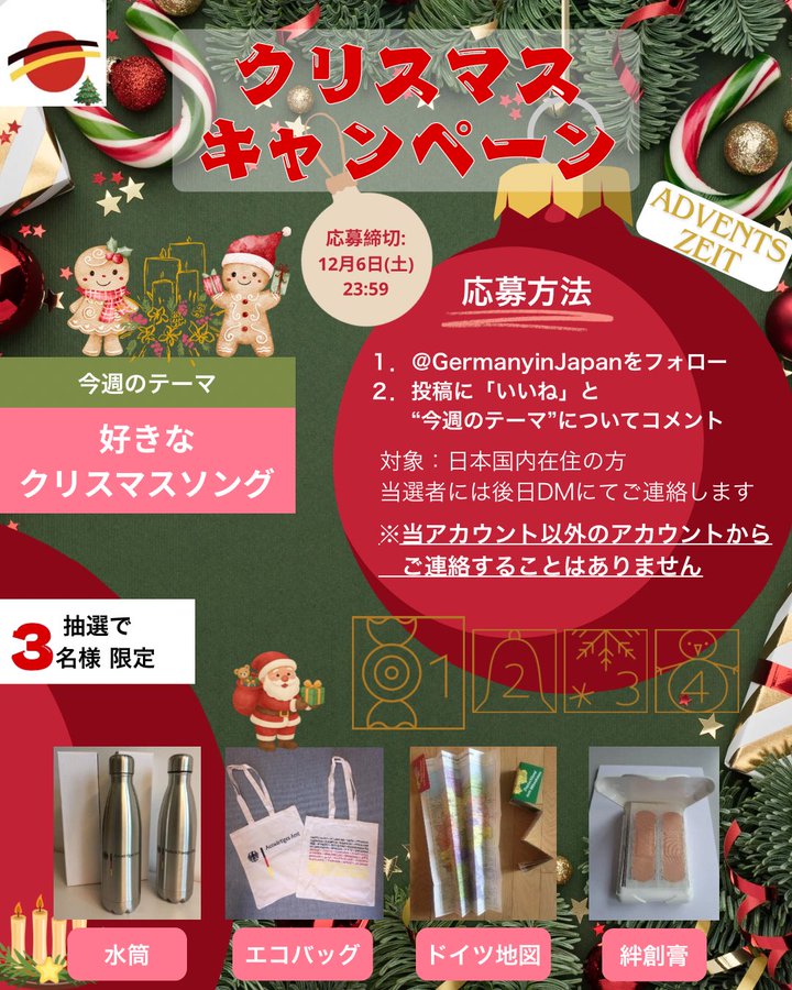【X懸賞】水筒・エコバッグ・ドイツ地図・絆創膏を3名様にプレゼント 2025.12.04ドイツ大使館‐クリスマスキャンペーン 賞品:水筒・エコバッグ・ドイツ地図・絆創膏(3名様) 締切:2025年12月6日(土)第1弾のテーマ:好きなクリスマスソング🎶 ※応募方法詳細は画像をご覧ください※詳細はキャンペーンページにてご確認ください。応募はこちらから