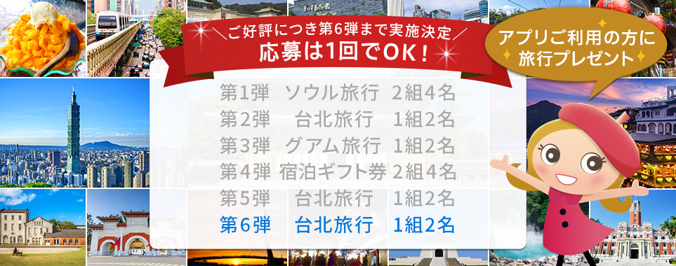 【アプリ】台北行き往復航空券およびホテルメトロポリタンプレミア台北2泊宿泊券(20万円相当)を1組2名様にプレゼント 2025.12.04トラベルコ‐旅行プレゼントキャンペーン 賞品:台北行き往復航空券およびホテルメトロポリタンプレミア台北2泊宿泊券(1組20万円相当)(1組2名様) 締切:2025年12月25日(木)アプリ内からご応募ください。※詳細はキャンペーンページにてご確認ください。応募はこちらから