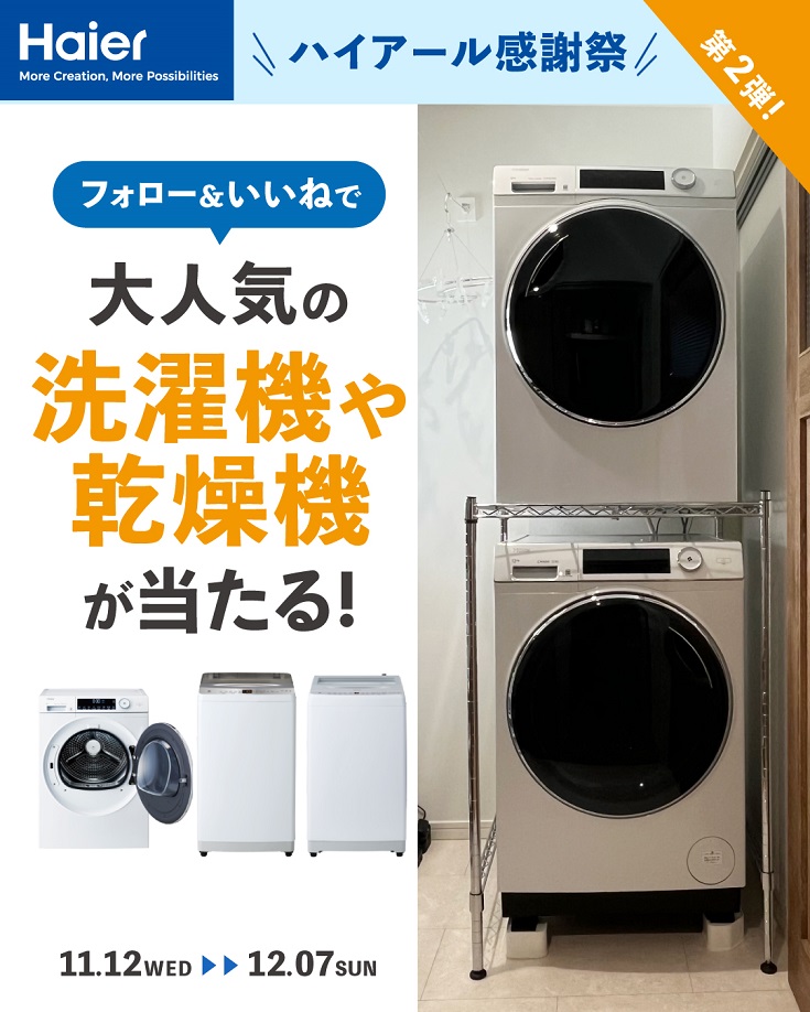 賞品:ハイアールの洗濯機・乾燥機5種類の中からお好きな1台(1名様)