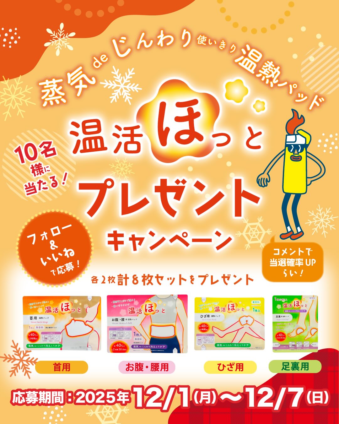 賞品:蒸気で温まる使いきり温熱パッド「温活ほっと」8枚セット(10名様)