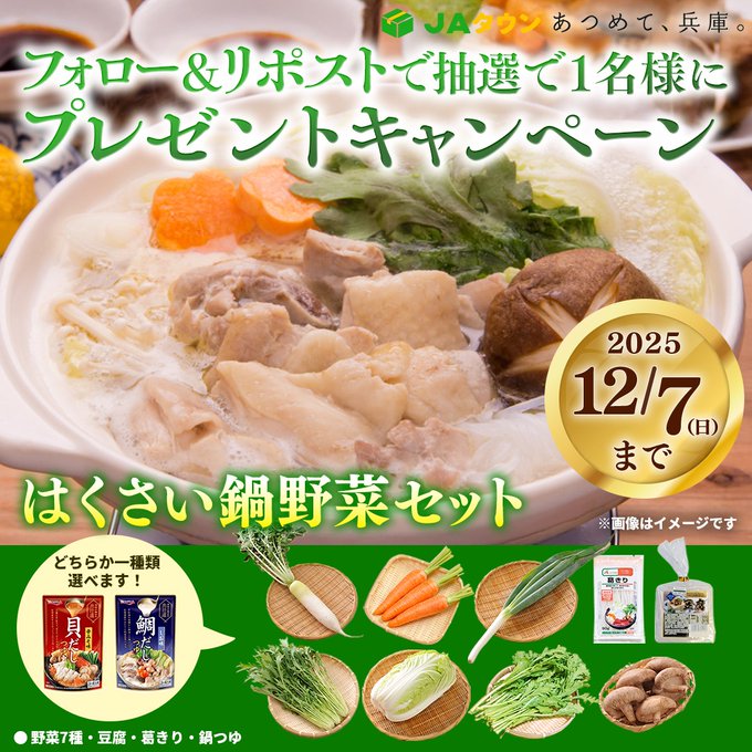 【X懸賞】はくさい鍋野菜セットを1名様にプレゼント 2025.12.05 2025.12.04JA全農兵庫‐フォロー&リポストキャンペーン 賞品:はくさい鍋野菜セット(1名様) 締切:2025年12月7日(日)公式X(Twitter)アカウントをフォロー&キャンペーン対象ポストをリポストしてご応募ください。※詳細はキャンペーンページにてご確認ください。応募はこちらから