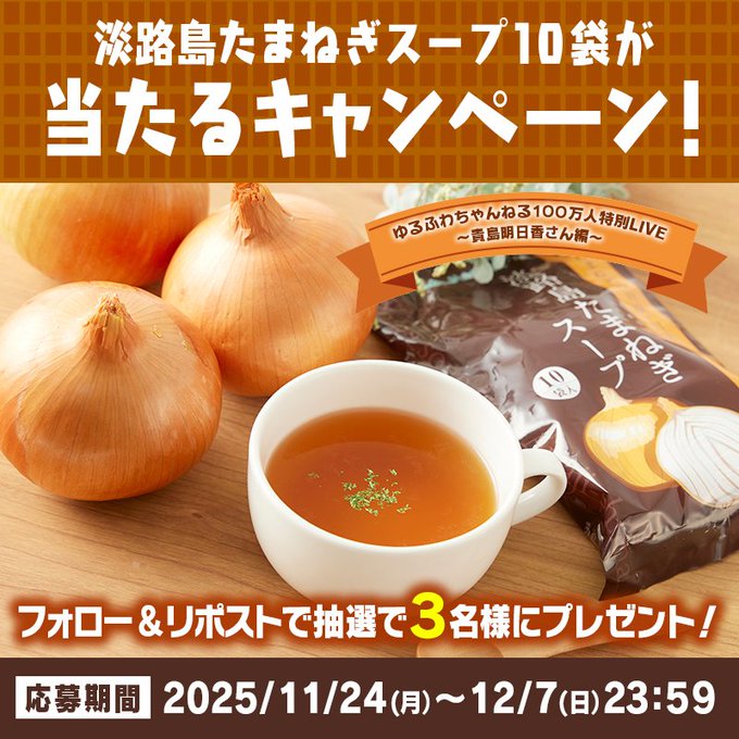 【X懸賞】淡路島たまねぎスープを3名様にプレゼント 2025.12.05ゆるふわちゃんねる‐フォロー&リポストキャンペーン 賞品:淡路島たまねぎスープ(3名様) 締切:2025年12月7日(日)公式X(Twitter)アカウントをフォロー&キャンペーン対象ポストをリポストしてご応募ください。※詳細はキャンペーンページにてご確認ください。応募はこちらから
