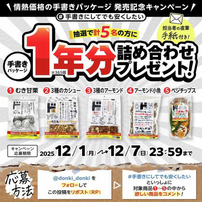 賞品:担当者の直筆手紙付き!手書きパッケージ商品いずれか1年分(5名様)